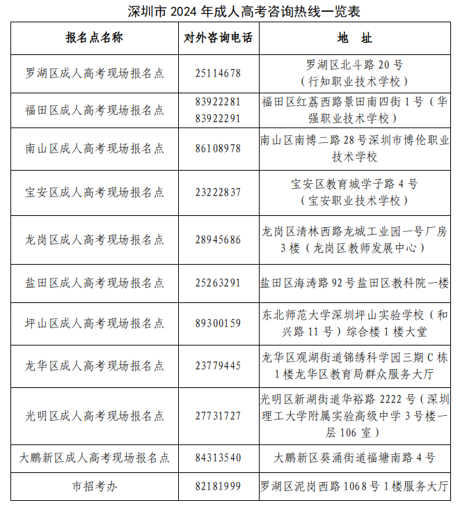 (四)各区报名点的工作时间是上午9:00—12:00,下午2:00—6:00(大鹏新区报名点工作时间:上午9:00—12:00,下午2:00—5:30),为了提高工作效率,请需到现场审核的考生提前复印、带齐相关资料。请考生听从工作人员的指示,按报名点的流程指引,安全、有序地完成各项报名手续。现场报名点周边停车场车位有限,请考生尽量乘坐公共交通工具,绿色出行。为方便各位考生在报名期间进行咨询,市招考办汇总各区现场报名点的咨询热线,如有问题,考生可拨打电话进行咨询。